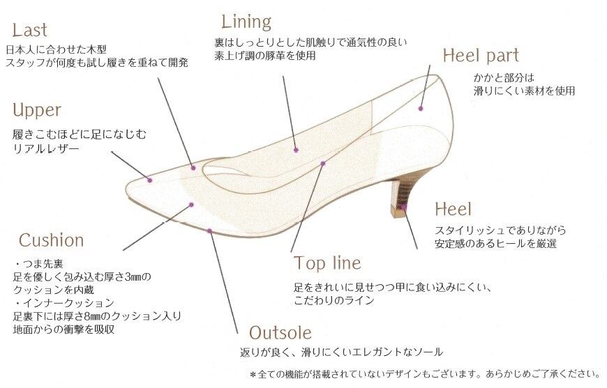 【半ボロネーゼ製法】屈曲性が高く、かかとが脱げづらいのが特徴です。厚さ8㎜のクッション入りで足当たりもソフトです。